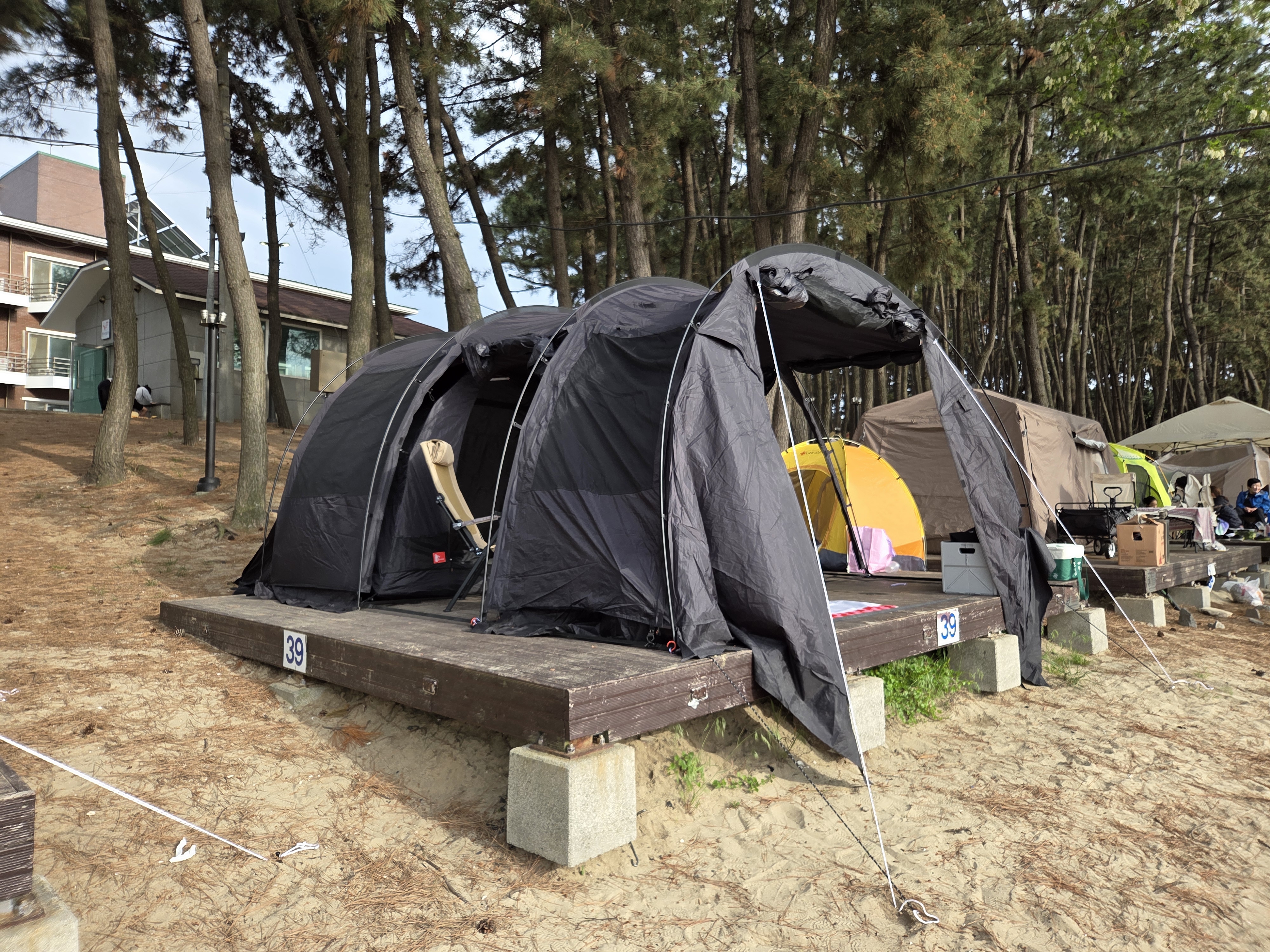 사이트마다 데크 높낮이가 조금씩 다르던데, 제가 예약한 39번은 옆 데크랑 꽤 가까웠고, 뒤에는 나무 장애물, 앞은 데크 높이가 좀 있어서 피칭하기 조금 애매한 곳이었어요.